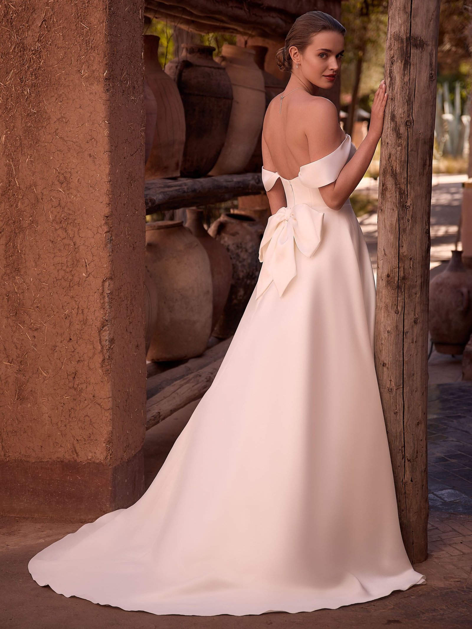 L’abito è impreziosito da uno strascico ampio, che aggiunge un tocco di regalità e crea un effetto scenico mozzafiato. La schiena scoperta offre un equilibrio perfetto tra sensualità e classe, mentre il collo a barchetta esalta le linee del collo e delle spalle in maniera affascinante. Il design con bretelle cadenti aggiunge un dettaglio romantico e delicato, rendendo l’abito ancora più unico e speciale.